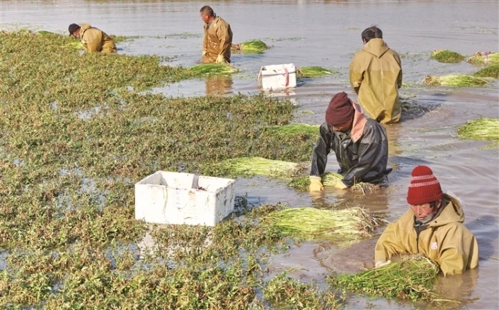 昨天,通州金沙街道进鲜港水芹基地的菜农们忙着采收水芹,供应周边城市节日市场。 记者 许丛军摄