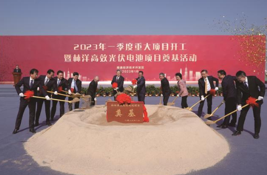 市委副书记、市长吴新明,市政协主席黄巍东,市人大常委会常务副主任、党组副书记庄中秋,市委副书记、宣传部部长沈雷等市四套班子领导前往南通经济技术开发区重大项目开工现场,为林洋高效光伏电池项目培土奠基。