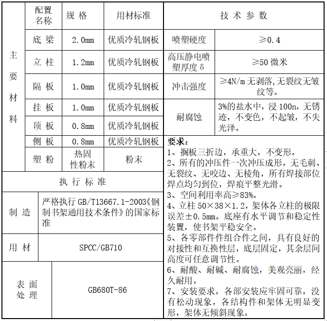 优质冷轧钢板,高压环保型静电喷涂;经清洗,除油,初锈,磷化处理等多道工艺处理;表面光滑,平整;外表美观、大方;双柱书架颜色:灰白色。