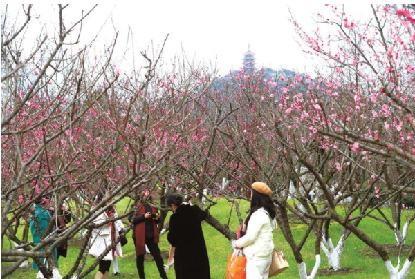 10日,游客在南通狼山国家森林公园“梅林春晓”赏梅。据悉,“梅林春晓”现有骨里红、绿萼、朱砂、宫粉、玉蝶等10多种数百株梅花,目前迎来了最佳观赏期,吸引了大批市民和游客入园。