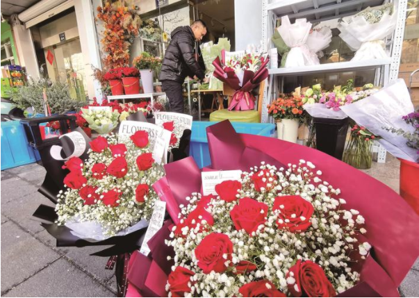 2月14日,当天是情人节,我市各大鲜花店内的花束热销。顾客纷纷提前预订鲜花,商家也提前备货,以满足市场需求。记者 徐培钦摄