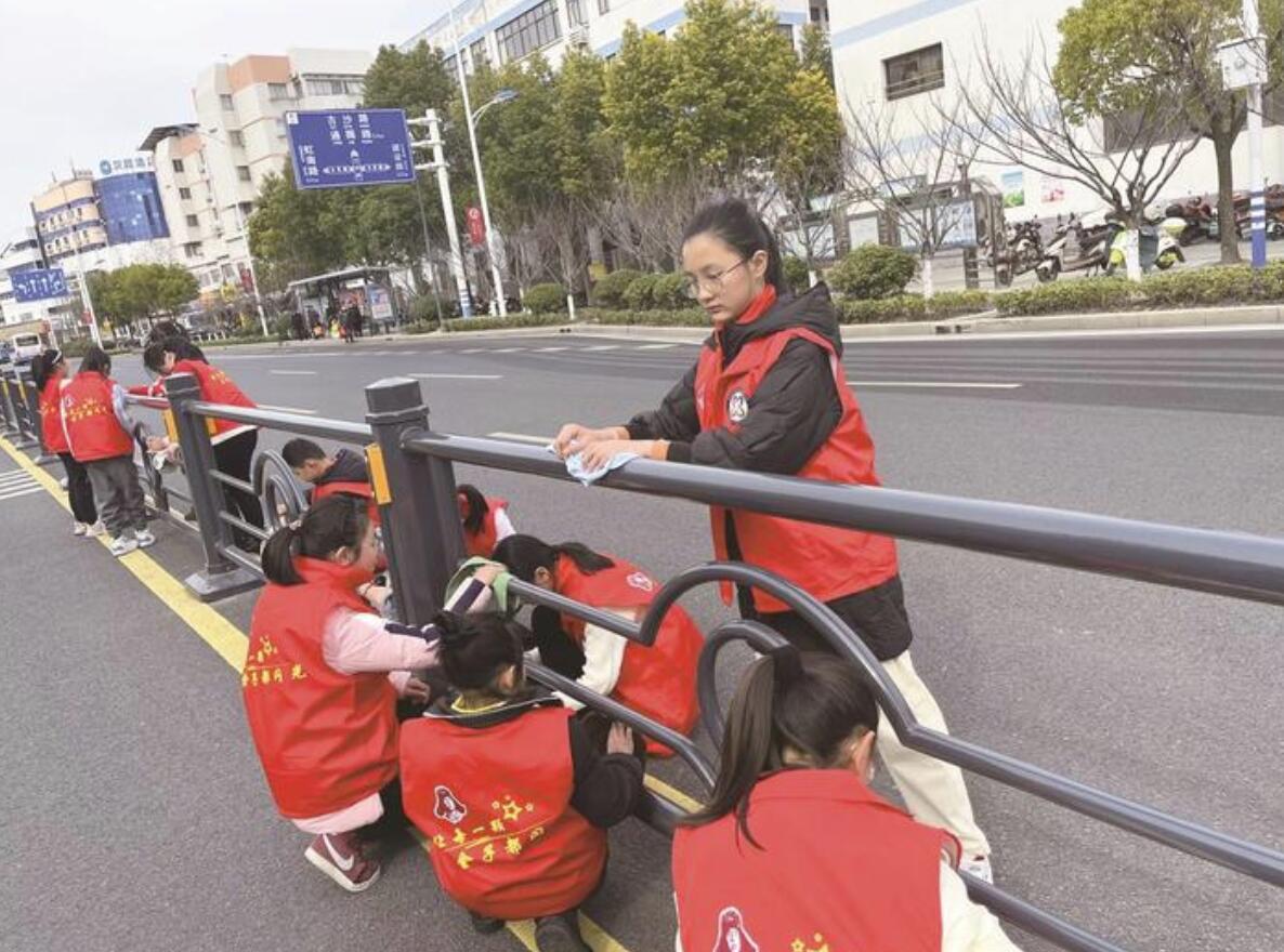 五(2)雷锋中队志愿者在擦洗栏杆。