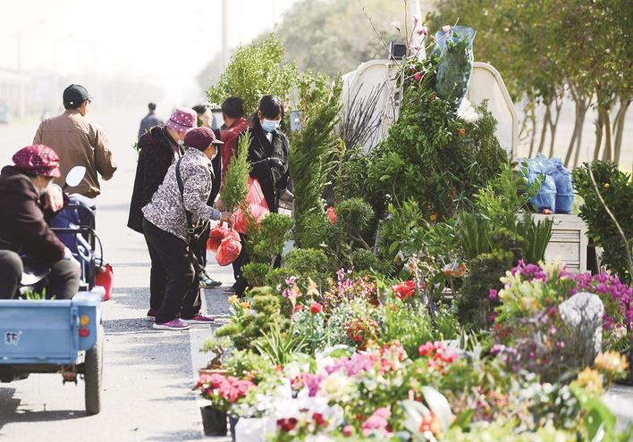 10日,在海安市孙庄街道庙会集市上,前来购买苗木花卉的村民络绎不绝。 顾华夏