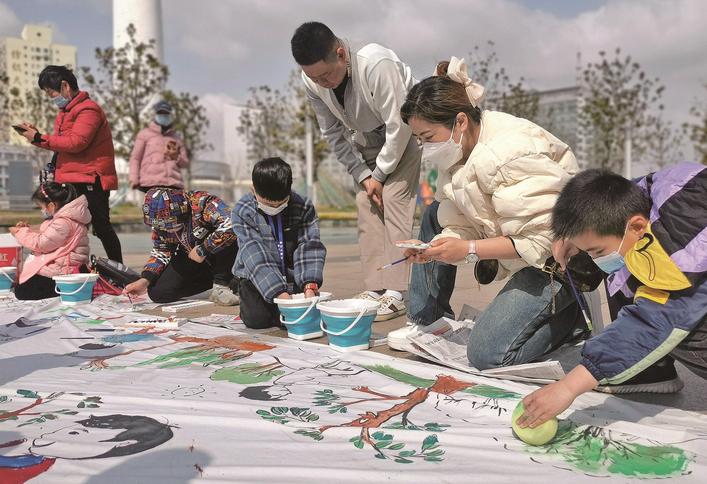 昨天,市市政和园林局在市区文化广场开展2023年度园林绿化“植树月”广场宣传活动。活动内容包括园林绿化咨询、花艺展示、法律法规宣传等。图为江海小记者在活动现场“共绘春天”。