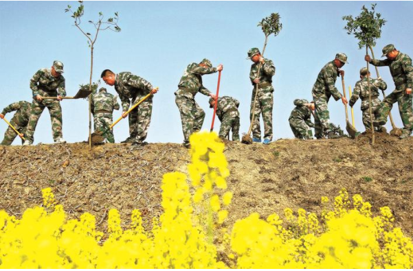 15日,海安市墩头镇新海村,身着迷彩服的基干民兵义务植树,用实际行动践行绿色发展理念,为美丽乡村增添新绿,美化农村人居环境。 周强摄