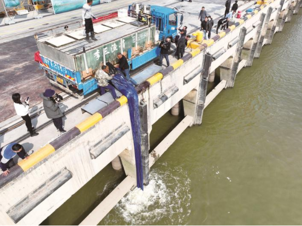 15日,通州区在长江进行渔业增殖放流。当天在长江通州段、九圩港河水域总放流鱼苗种76.5万尾,其中鲢鱼、鳙鱼鱼种约57.1万尾、草鱼鱼种19.4万尾。本次放流活动配合长江“十年禁渔”制度实施、巩固扩大禁渔成果,进一步改善长江水域环境和保护生物多样化。 记者 许丛军摄
