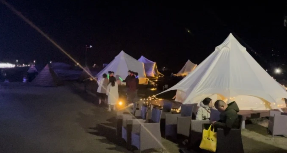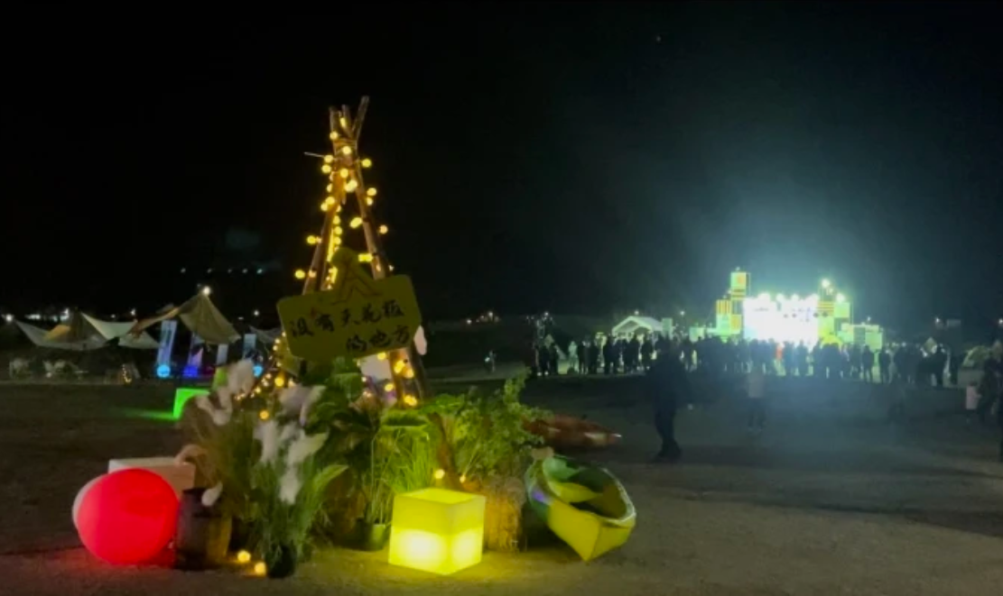 当晚开幕的启东“缤纷百里”花海露营节汇集了郁金香花会、璀璨灯展、春日市集、花船巡游、水幕电影以及篝火晚会等元素,游客们在帐篷前喝咖啡、尝甜品,聊春趣,轻松解锁远离城市喧嚣的轻松与愉悦。