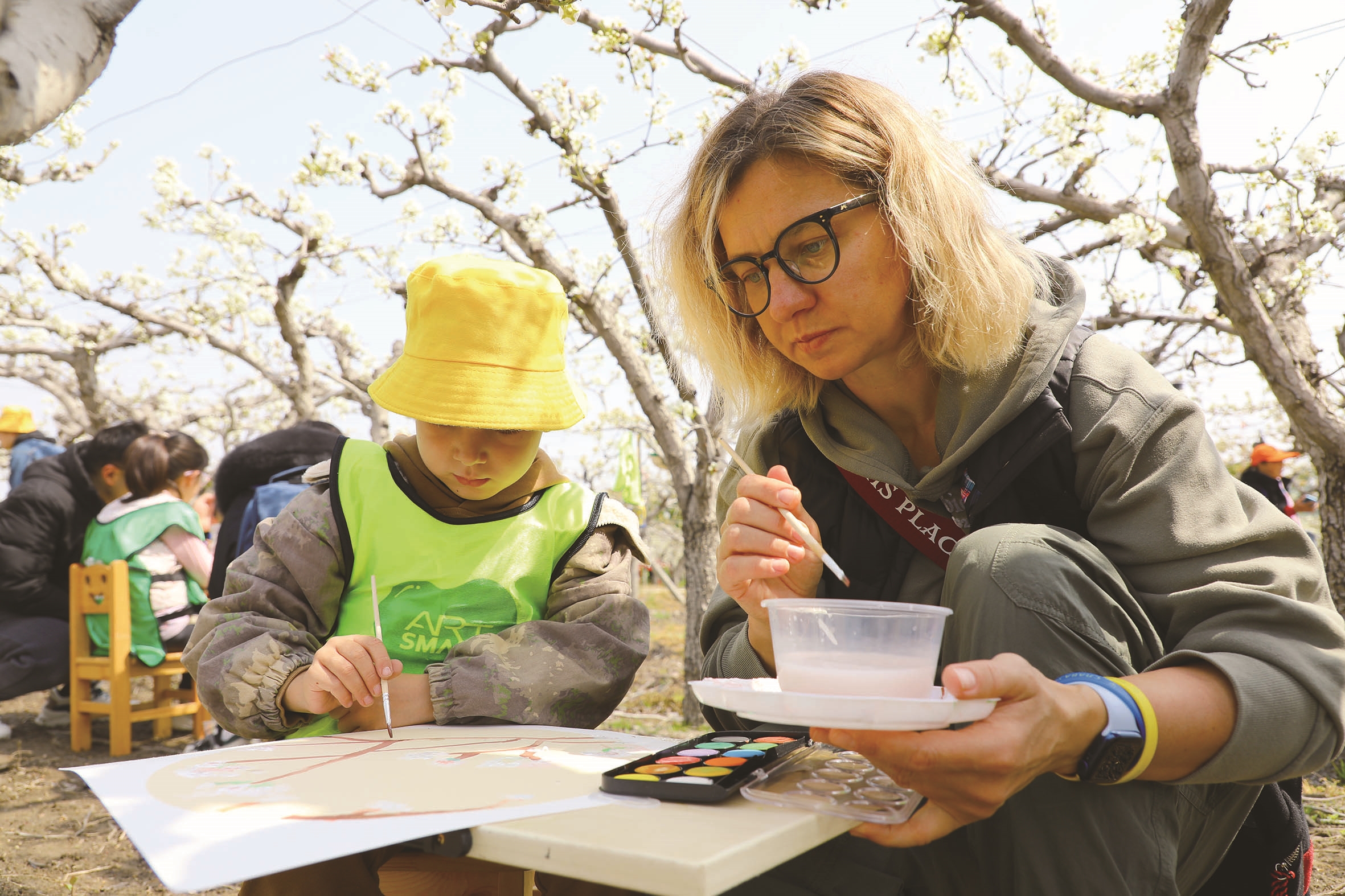 在赏花大道旁,上海美术家协会会员应鹤光铺开宣纸,在梨花下开始作画。他擅长画花鸟,经常出去写生,这是他第四次来大公,这次共约了6位上海画家,前一天就到达了。画家的身后,一群孩子正在写生,最引人注目的是一位外国妈妈,正在与她的孩子一起作画。应鹤光说:“大公镇的梨花景观在全国数得上号,画家就得亲近自然,灵感往往来自接地气的地方。”