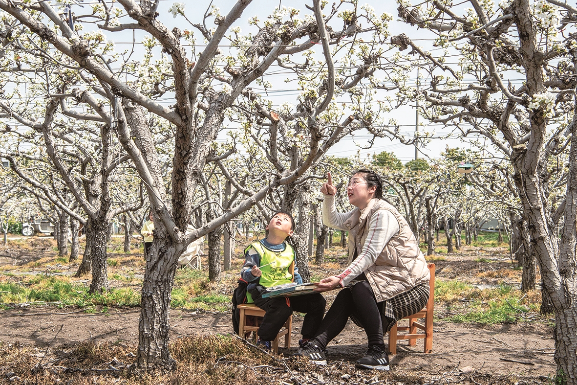 梨花下,一群少先队员正在倾听大公初中退休教师陈实讲梨树生长和农村变化的故事。大公镇幼儿园教师戴金梅说:“我孩子在海安市实验小学读书,他们五(17)中队有个红领巾寻访小组。前几天我在小组家长群里倡议,到大公梨花园里寻访‘春光里美景’哪里来,大家很支持,今天就带着孩子来了。”