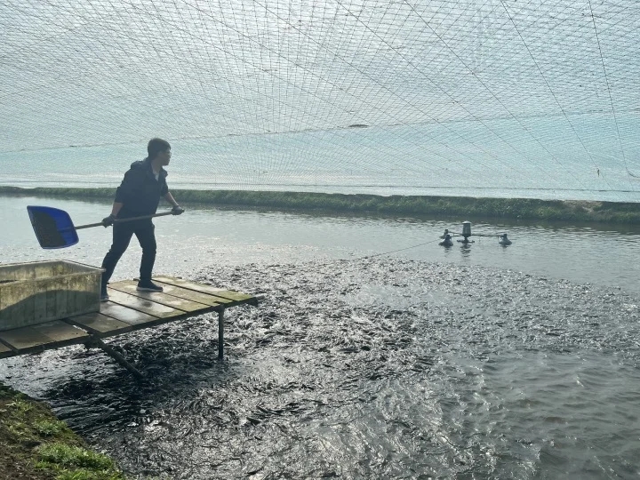 20日早晨天刚微亮,26岁的刘顺伟就来到养殖基地,他将一铲铲鱼粮撒向鱼塘,数万尾黑鱼瞬间跃出水面咬食,水面顿时沸腾起来。