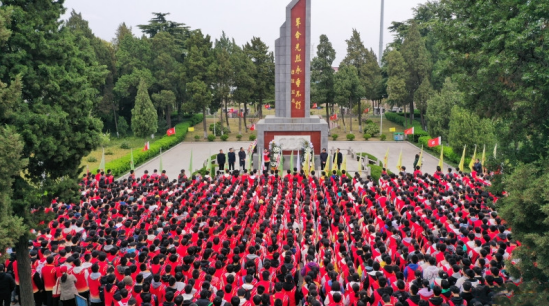 在吴庄烈士陵园,学生们胸口佩戴白花,神色庄严地站立在“革命先烈永垂不朽”的纪念碑前方,向烈士们献出花圈。随后,校领导和学生代表致悼念词,在悠悠的哀乐中,深深地缅怀先烈。全体师生共同合唱《我和我的祖国》,把最深情的怀念和最崇高的敬意寄托在这嘹亮的歌声中。