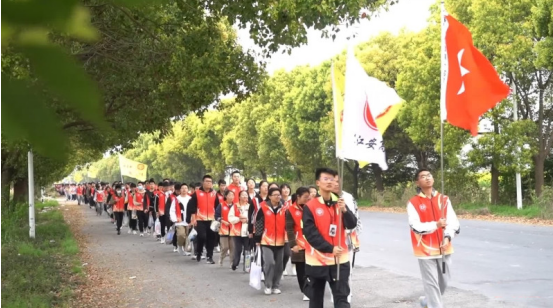 早上六点半,参与活动的一千八百多名师生已经在操场集合完毕,随时准备出发。在庄严的授旗仪式后,全体师生排着整齐的队伍,踏着春光,浩浩荡荡朝目的地进发。一路上,学生们洋溢着饱满的热情,昂首挺胸、阔步前行,一面面班旗迎风飘扬。