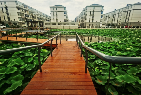 在改造中,把老旧小区改造与景观提升、河道治理、居民生活充分融合。“这是一条小区内河,分为南北两部分,由于水系不通导致河道发臭,经过实地查勘和多轮方案修改,我们决定通过在河道增设顶管的方式畅通水系循环,改善河道水质。”区人大代表、濠北社区党委书记席志芹介绍。同时,为了满足居民朋友休闲散步需求,原先破旧栏杆被拆除,新建护坡,并在河岸、河中央增设休闲步道,建设“九曲廊桥”景观,营造出“荷塘月色”的效果。
