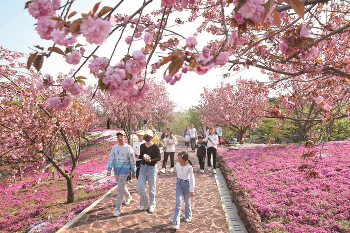 9日拍摄的南通市重点文旅项目洲际梦幻岛美丽景色。眼下,梦幻岛晚樱、芝樱盛开,樱花谷、火山口、梯田花海等核心景观犹如打开的多彩调色盘,吸引了众多游客踏青赏花享春光。