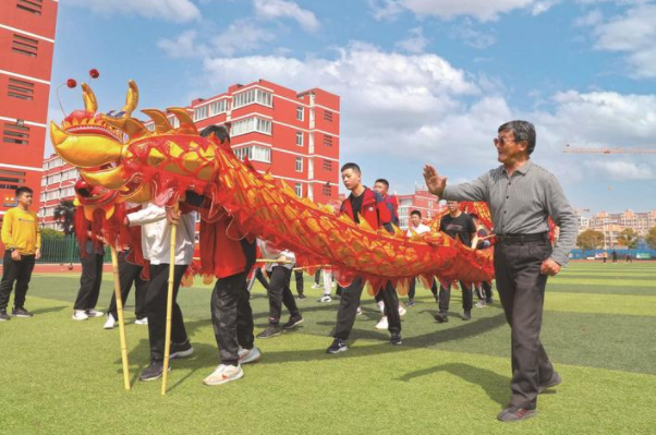 昨天,海安曲塘高级中学的同学们正在操场上练习舞龙。该校邀请龙舞传承人为校外辅导老师,将传承非遗项目与创建特色课程相结合,促进非物质文化遗产的普及。 顾彬斌摄