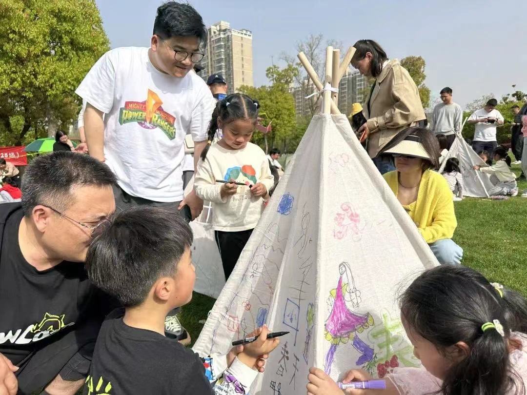 通师一附万濠星城幼儿园的孩子们则在明媚的周末相聚曹顶公园,参加了别样的亲子帐篷读书会。搭起帐篷,铺开餐垫,爸爸妈妈和孩子们席地而坐,在找春天、读春天、画春天、拍春天等环节中,描绘书中愿景,定格阅读瞬间。