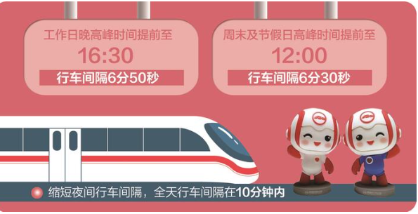 1号线缩短夜间行车间隔,全天行车间隔在10分钟内。1号线工作日晚高峰时间提前至16:30,行车间隔6分50秒。周末及节假日高峰时间提前至12:00,行车间隔6分30秒,请广大市民乘客合理安排出行时间。