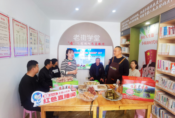 “这是绿色养殖的东串猪,吃的是纯天然有机原粮。这种猪的肉质肥瘦得当……”4月15日,丁堰镇三桥三河社区老街学堂的特色直播间内,主播宗媛媛正通过微信视频号、抖音平台同步对外直播。“咱们的小手不要停,公屏上点点赞的……”“是的,猪肉是自产自销的。”主播卖力推介,与网友实时互动,直播间热火朝天……