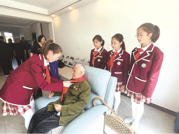杨雨萱给黄爷爷敬献红领巾,黄先明说,让他先换上军装。换上军装,系上红领巾后,老人的笑声更加爽朗,说自己是98岁的少先队员。