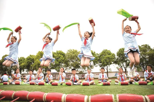 2020年6月11日,海安城南实验小学东校区三年级的孩子在操场上跳起“海安花鼓舞”。这一瞬间,被刊登在6月14日的《人民日报》一版上。