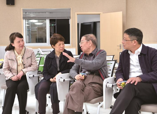 昨天,李大潜院士(右二)和我市教师在一起座谈。 陶圆
