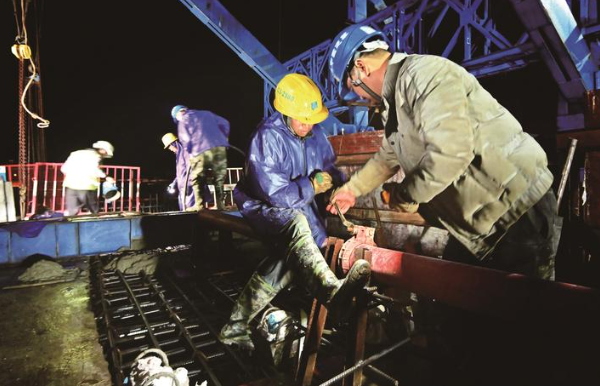 18日雨夜,工人在现场抓紧施工。历经3个多小时的混凝土浇筑作业,截至19日零时许,绕城高速通州段迎来重要节点,江海河大桥悬浇梁右幅中跨成功合龙。