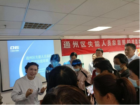 18日下午,通州区近50名失能人员家属聚集在天熹社区学习失能人员家庭照护技能。专业护理师理论与实际操作相结合,认真示范、指导,失能人员家属学到更多的专业护理知识,提升了其护理技能。