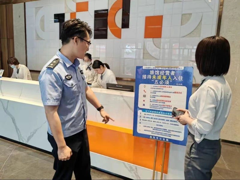 为保护未成年人健康成长,加大对未成年人的特殊保护力度,增强未成年人自我保护意识,进一步规范旅馆业管理,5月26日,启东市公安局治安大队深入旅馆业开展未成年人入住“五必须”走访活动。走访中,从旅馆内是否在显著位置摆放未成年入住“五必须”标识牌、是否张贴警示海报、未成年人入住台账是否规范、前台工作人员接待未成年人入住流程、旅馆经营者是否知晓“五必须”制度等方面进行了全面细致检查。同时结合日常案件向旅馆经营者、前台工作人员进行现场讲解《中华人民共和国未成年人保护法》《旅馆业治安管理办法》等相关法律法规。
