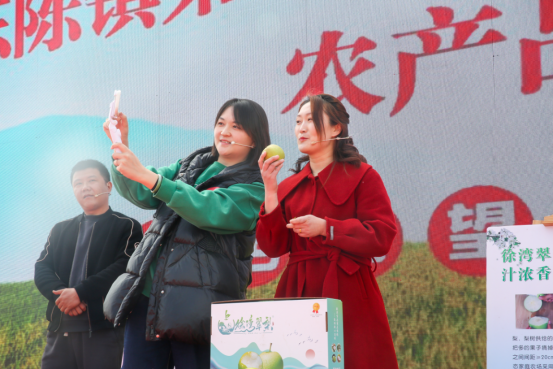 “你们看啊,我们这个翠梨独具形美、味甜、多汁,咬上一口,甜蜜的汁水满口充盈,再从嘴角溢出......”近日,在东陈镇徐湾社区的大舞台上,一场关于“青年直播助农”的小品正在上演,表演者逐一对着直播间介绍山河水蜜桃、徐湾翠梨、全红草莓等东陈镇特色农产品。