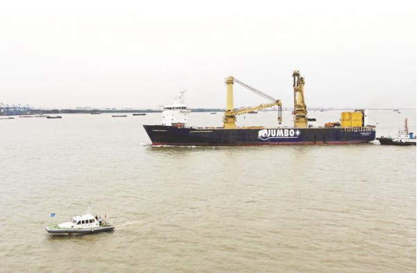本网讯 (记者吴霄云 通讯员孙岩)4日,在海事部门的严密监控和现场维护下,“尊宝动力”轮装载着600吨总重的炼油模块,缓缓驶离如皋森松重工码头,驶往伊拉克(上图)。
