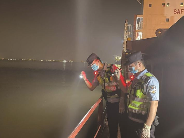 “‘新太平’轮即将靠泊,巡查组已到位。”22时许,中国籍“新太平”轮靠泊通海码头。巡查民警穿戴好执勤装备登上轮船,有条不紊地开展入境检查,对船舶船体及船员情况进行检查了解。