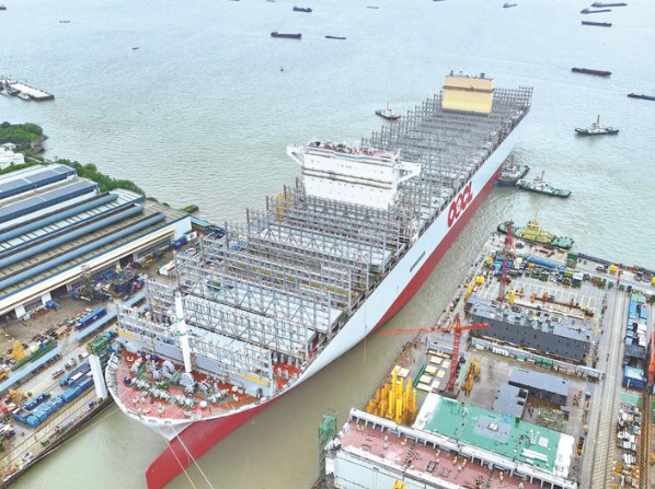 本网讯 (记者许丛军)26日,又一艘中国自主研发设计的新一代高性能超大型集装箱船在南通顺利出坞。这艘最大载箱量达24188标箱的集装箱船是南通中远海运川崎为东方海外货柜航运公司建造的6艘同型船中的第3艘船,该型船是新一代超大型智能、绿色集装箱船的典型代表。