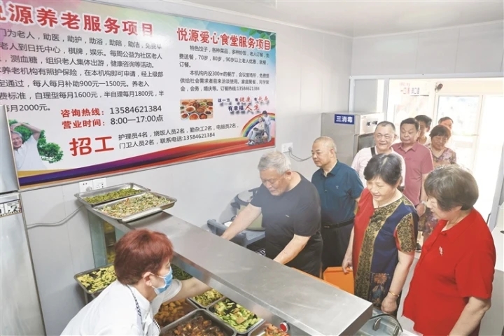 6月27日,老人们在如东悦源爱心食堂用餐。悦源爱心食堂今年5月开张迎客,60岁以上老年人凭身份证可享八折优惠,食堂还为老人提供免费送餐服务。老年人用完餐后,还可以在隔壁50多平方米的公益活动中心参与各种公益活动。 记者 许丛军摄