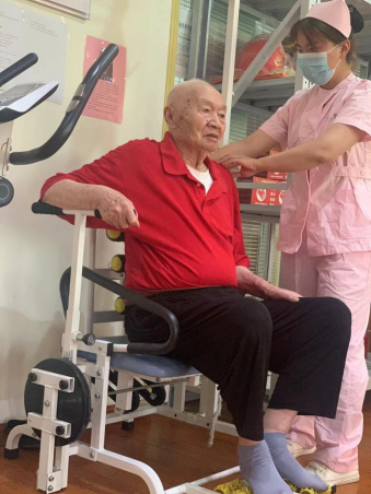 “奶奶,来,跟着我一起做,手掌张开,合上。”每天,高店社区长者驿家的护理员施美华都会带着院里的失能老人做康复训练,王宝英奶奶今年102岁,是长者驿家年纪最大的老人。“我们的年纪也大了,孙辈们平时工作也忙,照顾老人也比较吃力,这边有专业的照护团队,还有康复师,离家也近,住在这儿我们放心。”王宝英的儿子每周都会来看望老人,看着老人精气神一天比一天好,子女们也很安心。