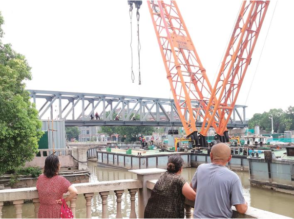 南通市崇川区跨越通扬运河的杨家湾人行桥重建工程现场,钢析梁13日吊装就位。目前,施工人员冒着高温抓紧施工,争取早日完工。