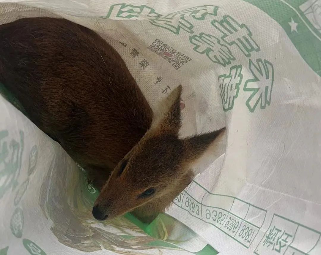 据纪先生描述,其在上班地点旁边的菜地里发现了它,担心小动物乱跑会遇到危险,于是将其暂时安置在一个敞口的袋子中。在检查确认獐身体没有异常后,民警驱车将其送至老坝港与东台交界的树林中进行放生。