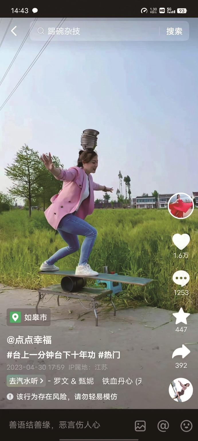 在如皋乡间田野表演脚踩滚轮、头顶踢碗、一字马……一系列如此高难度的杂技动作,通过抖音平台,让如皋市博主刘敏(抖音名:点点幸福)火遍网络。该账号当前吸粉超过510万,一个作品的点赞量多则200万+,少则也有数万。