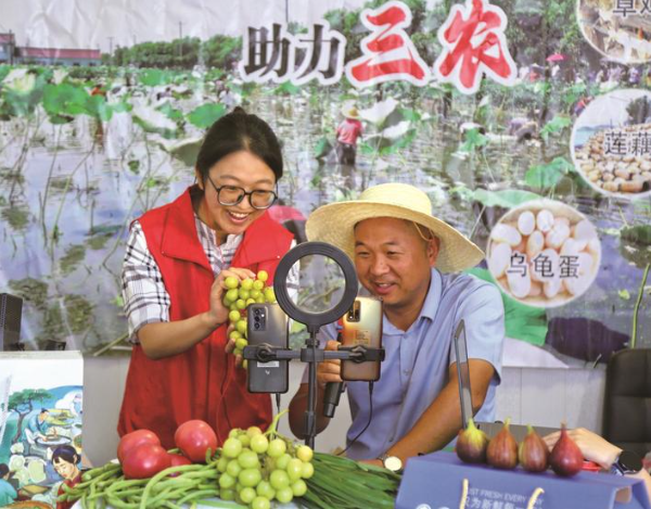 昨天,海安市墩头镇新舍村,志愿者与农村经济带头人一起直播带货。该村凭借电商服务站——“村邮驿站”,畅通农产品出村进城、工业品下乡进村渠道,服务农村生产生活。 周强