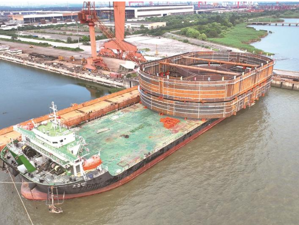 15日,崇启公铁长江大桥4号主墩钢围堰从如皋装船运往施工现场。据了解,崇启公铁长江大桥主通航孔桥及非通航孔桥水上钻孔桩开累完成359根,其中南北主塔墩3、4号墩钻孔桩设计152根全部施工完成,目前桥位现场正在为本月下旬钢围堰吊装下放做准备。记者许丛军