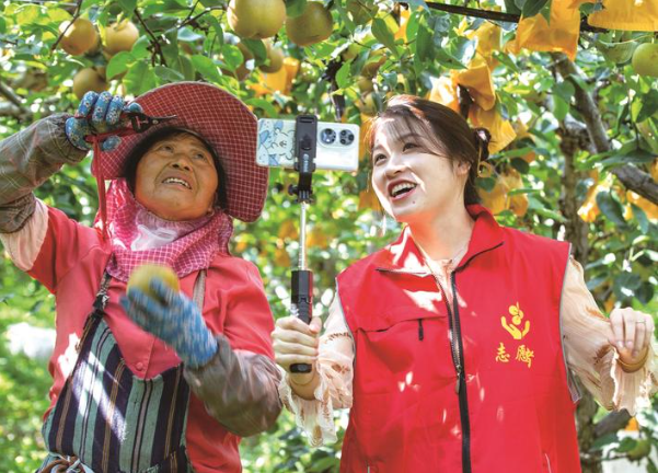 昨天,青年志愿者走进海安市大公镇于坝村梨园,开展直播增收公益活动,帮助果农拓宽销售渠道。