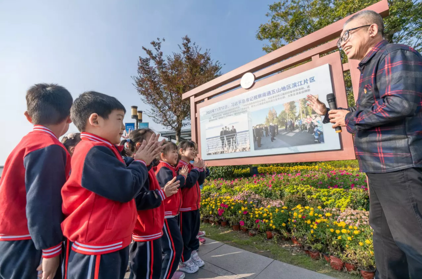 “金山银山不如绿水青山,南通市委市政府下大力气推进五山滨江地区生态修复工程,还广大市民一片绿水青山。因此,我们在游览的途中要像爱护自己家一样保护好沿江生态环境,不要乱扔垃圾、垃圾要分类投放……”狼山镇街道环保志愿者吴湛正在滨江公园进行生态环保微宣讲,通过展示长江旧貌插图,带领游客领略近年来滨江生态保护关停散乱污企业、退出沿线港口货运功能、修复长江岸线,新增森林面积等变化,让大家沉浸式地感受到滨江地区生态修复成果,激发广大市民的环保自觉,并向往来游人宣传生态保护小知识、垃圾分类小窍门。