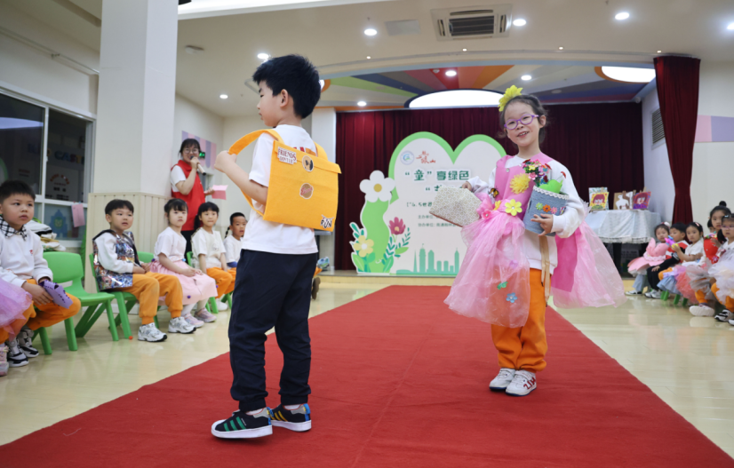 一张废报纸、一只易拉罐、一个塑料袋……这些生活中不起眼的废旧物品在孩子们的奇思妙想和巧手装扮下,旧物变“霓裳”。废报纸经过精心剪裁“变身”小马夹,塑料袋摇身一变成了彩色公主裙,易拉罐经过组合、拼接成了一顶小礼帽。萌娃们身着自己制作的“盛装”,化身“环保时尚小达人”,摆出不同的pose,大方展示自己。