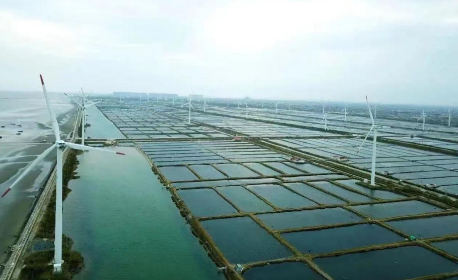 盛夏时节,一台台风电机组矗立在启东沿海滩涂,映衬着蓝色的海面,构成一幅美丽的生态画卷。