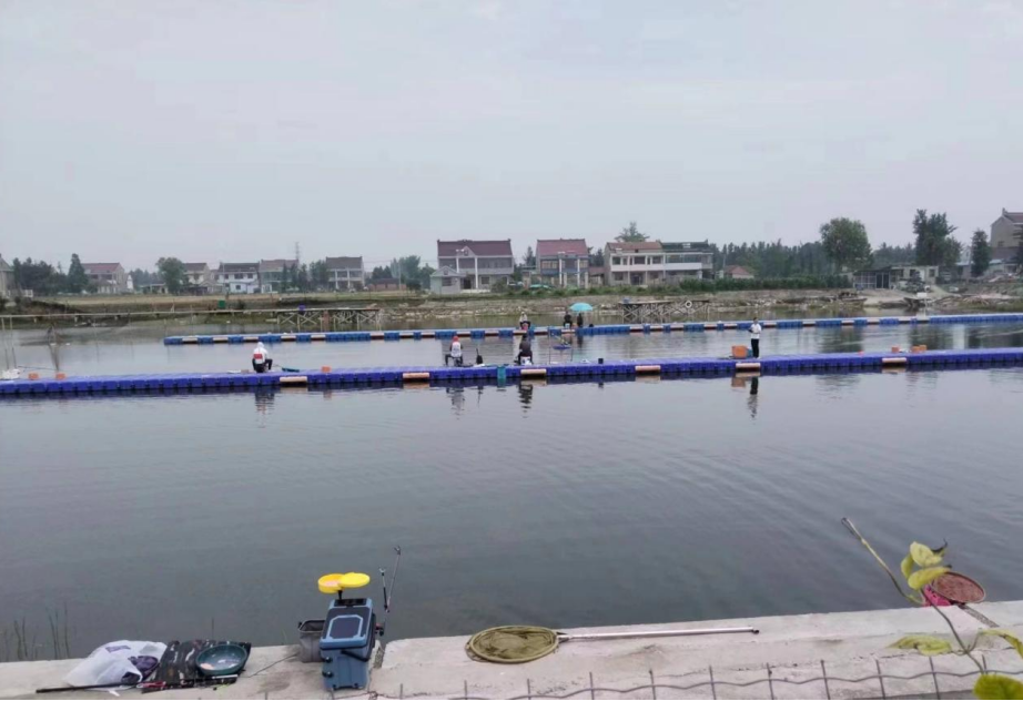 站在吴窑镇沈甸村立南河桥上远眺,波光粼粼的水面上,一个个白色浮球排列得井然有序,闪耀着“珠光宝气”,湖面上不时有鱼儿泛起的涟漪。