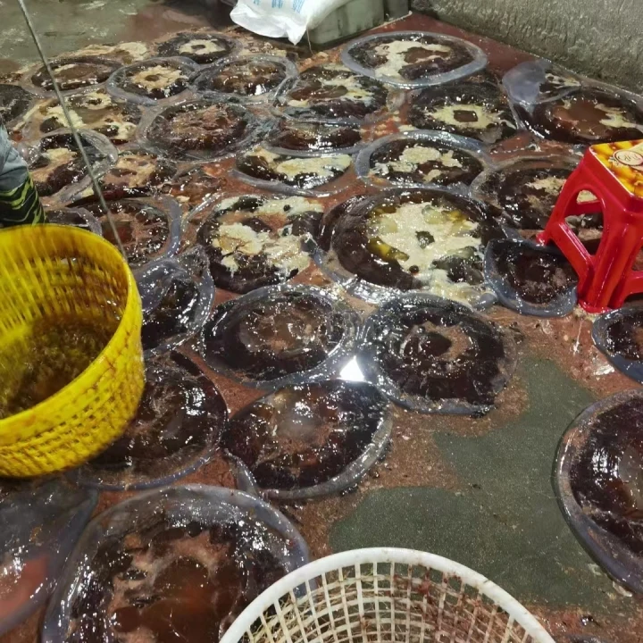 “看看!这一筐筐的,都是最新鲜的海蜇,多漂亮!”15日,水产商贩杨老板在朋友圈激动地晒出了即将收购的十几筐海蜇。画面中,工人们有的正忙着将海蜇头和身体分离,有的正用力刷去海蜇头上附着的褐色保护膜。