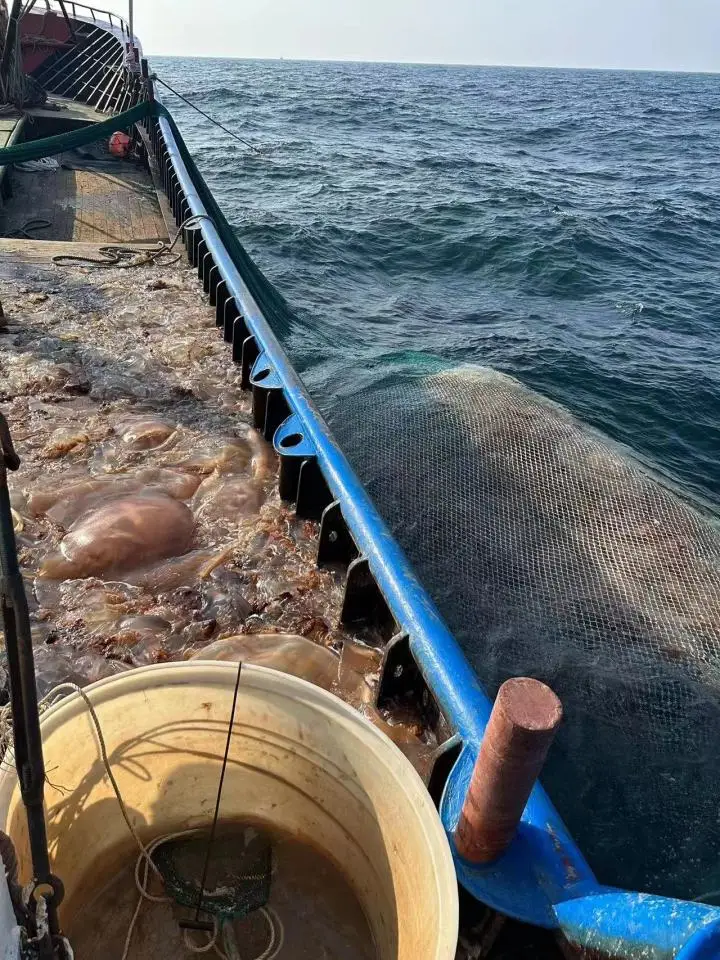 “沙海蜇打捞上船后,我们会直接在船上对沙海蜇进行分离。”苏海安渔00304船长吴志均介绍,由于沙海蜇身体柔软,含水量高达95%,被捕捞到船上后极易死亡,死亡后的沙海蜇又很快会变质甚至溶化。