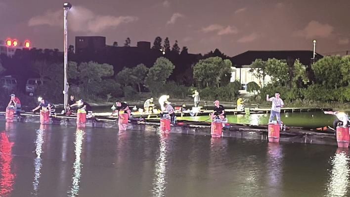 晚上8时许,在濠河边的亲水步道上,六七名钓友带着小座椅和鱼桶一字排开,放好鱼食、挂上诱饵篮,用力一抛,鱼漂入水,完成了一次完美的抛竿。