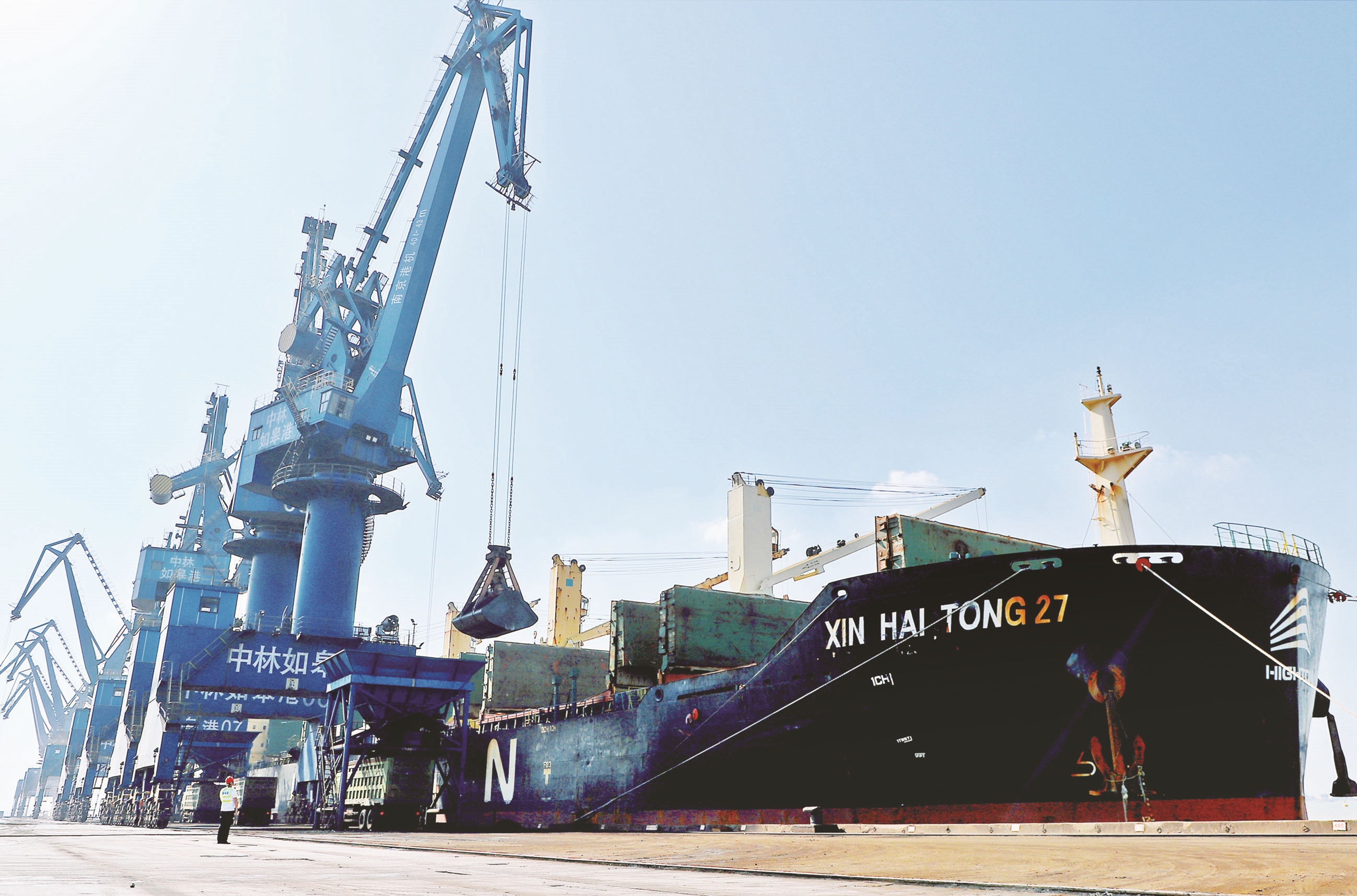 9日,中林如皋港务集团有限公司码头,大型机械从散货船上卸下电煤。今年以来,如皋港务集团不断加大电煤运输组织保供力度,1月至8月完成吞吐量1838万吨。其中,外贸进口煤炭作业量同比增长124%,内贸进口煤炭作业量同比增长25%。(薛冯 吴树建摄)