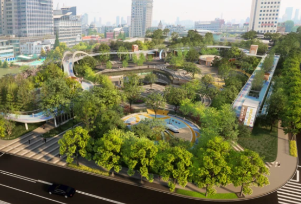 体育公园站一体化工程由南通轨道交通2号线体育公园站、一体化商业开发、地上体育公园组成。体育公园站出入口结合地面景观设计与南通轨道交通2号线建设,充分完善户外活动服务设施,并在尊重原有风貌元素的基础上,景观化处理轨道出地面的附属设施,保证广场整体性,同时在地面设置一定的体育活动空间,让市民享有便捷舒适的运动场所。市民可穿越冠军之门,重走冠军之路。