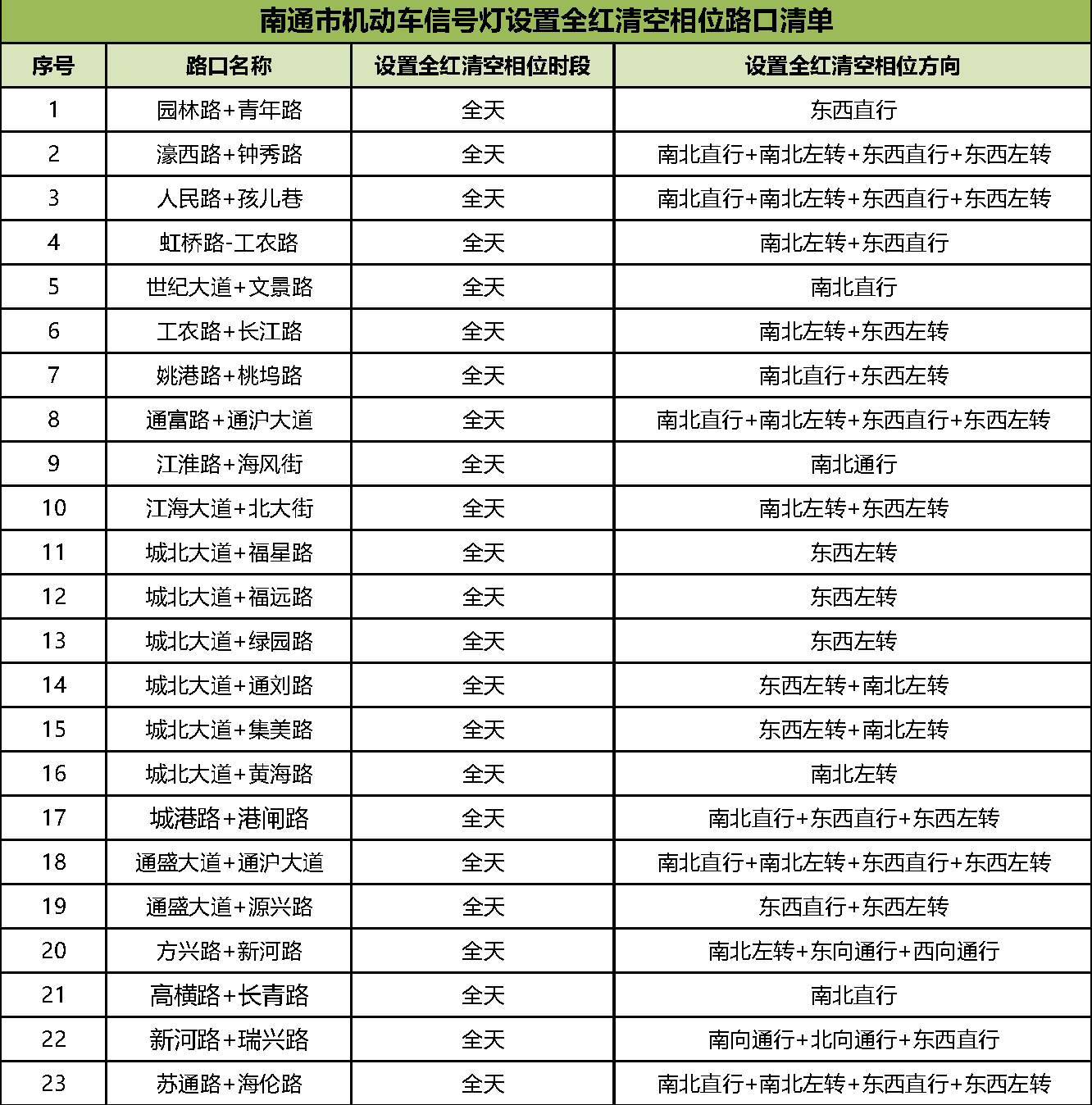 南通网讯 路口各个方向全部亮起红灯,这不是信号灯故障,而是有意设置。昨天,记者从市公安局交警支队获悉,目前,市区共有23个路口设置了“全红信号”,避免即将离开路口的车流与即将进入路口的车流发生冲突,从而保证出行安全。